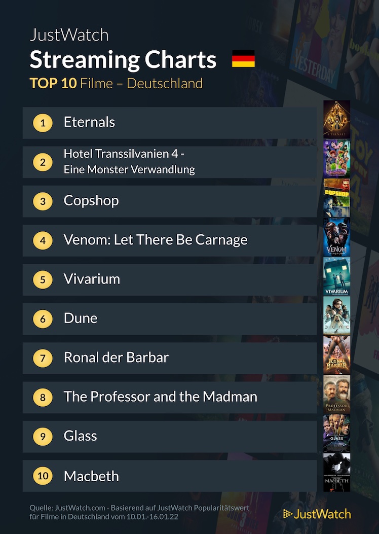JustWatch ermittelt jede Woche die Favoriten der deutschen Zuschauer. „MacBeth“ stieg auf Platz 10 ein. Auf den ersten drei Plätzen: „Eternals“, „Hotel Transsilvanien 4“ und „Copshop“.