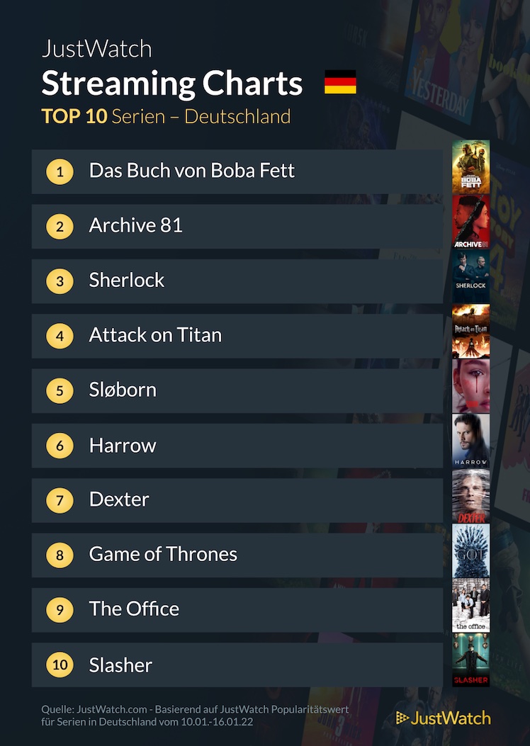 Bei den Serien findet sich unter den Top 10 keine Sendung von Apple TV+. Der Spitzenplatz überrascht uns nicht: Disney+ hat mit „Das Buch von Boba Fett“ einen Blockbuster gelandet. Auf Platz zwei und drei folgen „Archive 81“ von Netflix und die BBC-Kultserie „Sherlock“.
