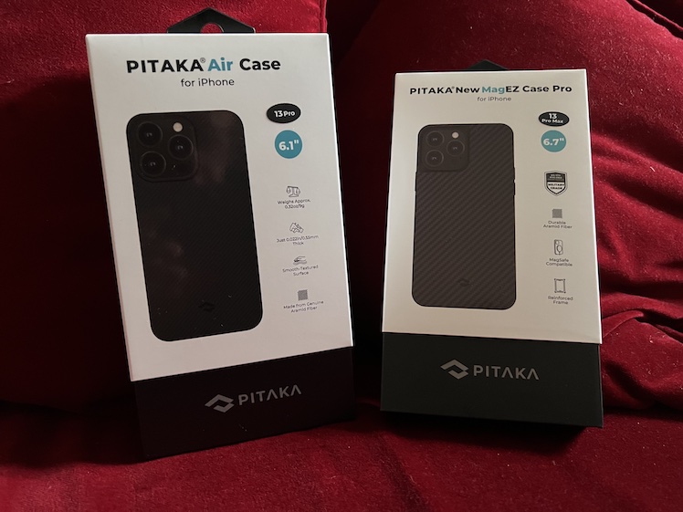 Die ersten zwei Pitaka-Cases sind kompatibel mit iPhone 12 und 13. Beide sind in elegantem Schwarz und aus Aramid-Faser gefertigt. Sie ist besonders widerstandsfähig und edel zugleich. Weil sie nicht der MagSafe-Reihe angehören, sind die Cases enorm dünn und leicht. Beide unterstützen natürlich das Laden der Geräte mit Qi-Ladematten.