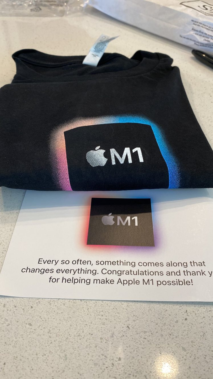 Das Unternehmen bedankt sich bei seinem M1-Team mit einem kleinen Geschenk. Es gibt ein T-Shirt, auf dem das Logo des M1-Chip aufgedruckt ist. Übrigens nicht nur in der Größe M, sondern je nach Gewicht und Größe der Mitarbeiter auch in S, XL, XXL und 3XXL…
