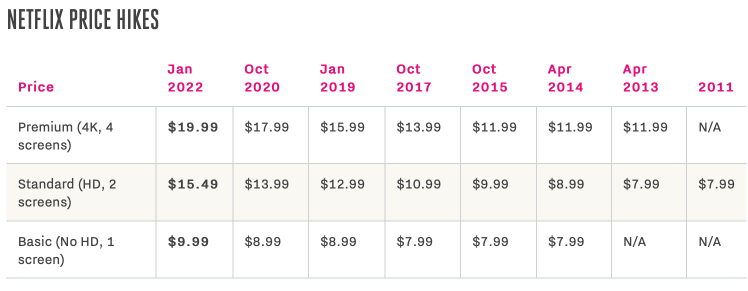 Wie sich die Preise von Netflix in den USA in den vergangenen elf Jahren entwickelt haben, zeigt die Grafik von TheVerge.