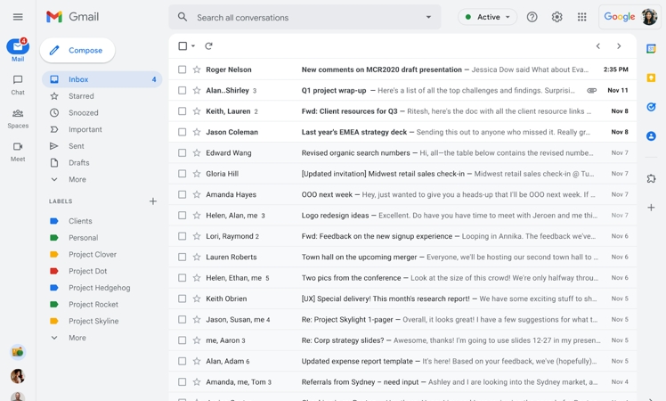 Daneben finden sich die einzelnen Postfächer und Tags, während im Hauptbereich wie vorher die Mailliste zu finden ist. Das Ganze wirkt aufgeräumter und kompakter als zuvor, was Googles neuem Material Design entspricht.