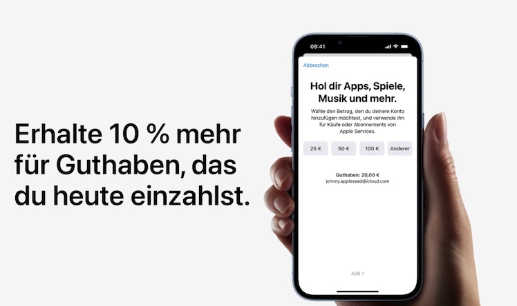 Die Apple-Aktion läuft bis zum 2. Juni. Die Aufladebeträge sind variabel. Ab 10 Euro geht es los, der Maximalbetrag liegt bei 300 Euro. Das Angebot kann pro Person nur einmal genutzt werden.