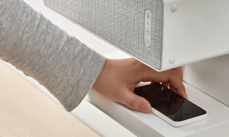 Das SYMFONISK-Regal bietet oben einen Platz für einen SYMFONISK-Speaker. Unten gibt es eine Ablagefläche, in der ein Qi-Lade-Pad eingebaut ist. Mit diesem könnt Ihr Euer Smartphone kabellos aufladen.