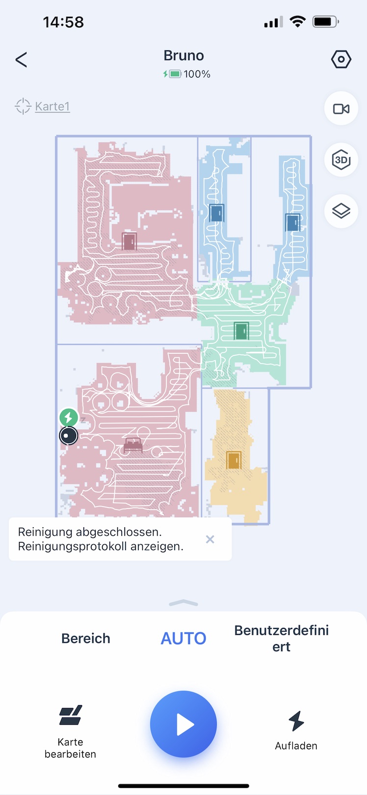 Wie haben den Deboot nun drei Wochen in Gebrauch. Liebevoll haben wir ihm in der App den Namen „Bruno“ gegeben, und einen Zeitplan erstellt. So lassen wir ihn Montag, Mittwoch und Freitags jeweils um 12.00 Uhr zur Mittagszeit völlig selbstständig seine Runden drehen.