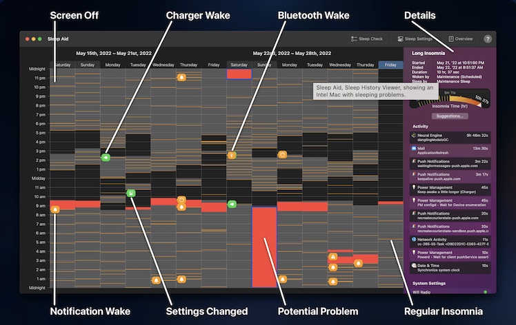 Sleep Aid überwacht den Mac-Ruhezustand und protokolliert Probleme im Detail. Ich selbst habe häufiger Probleme, mein M1 MacBook Pro 2021 mit angeschlossenem Monitor im 1. Versuch in den Ruhezustand zu versetzen. Gleiches berichten Mac-Studio-User.
