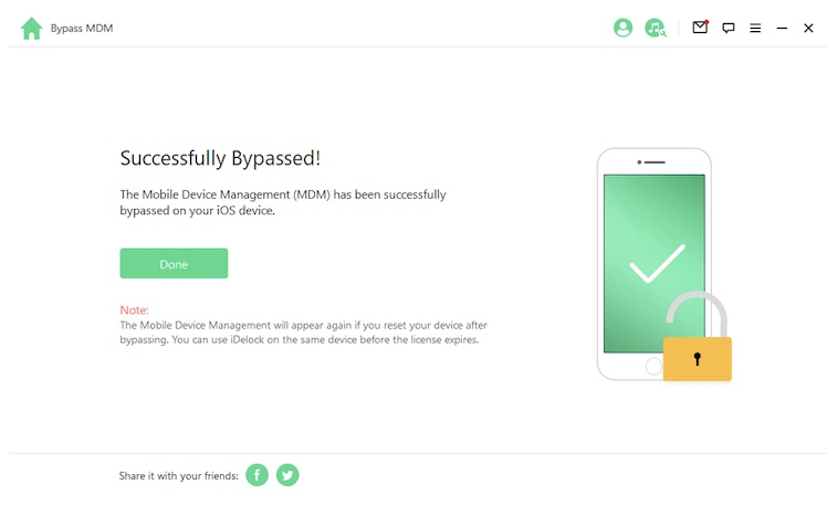 Ein wichtiger Hinweis: Das MDM wird wieder angezeigt, wenn Ihr Euer Gerät nach der Umgehung zurücksetzt, und Ihr könnt jederzeit iDelock verwenden, um dasselbe Gerät zu entsperren, bevor die Lizenz abläuft.