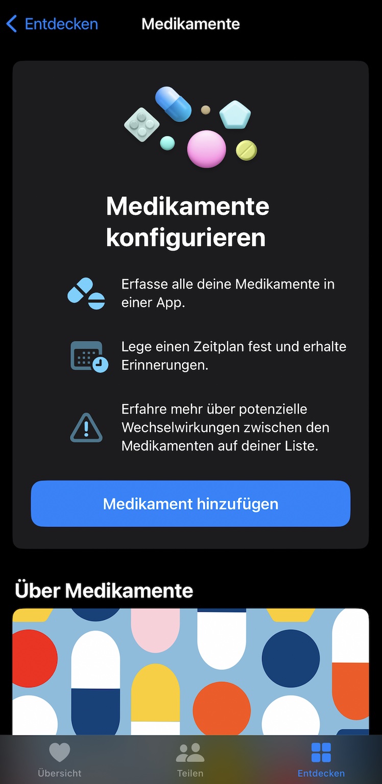 Das Einrichten neuer Erinnerungen läuft über die App unter iOS 16. Tippt im Abschnitt „Entdecken“ auf „Medikamente“. Hier könnt Ihr Eure aktuelle Medikation einsehen und neue Mittel hinzufügen.