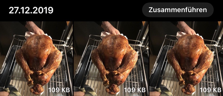 In iOS 16 ist ein neues Tool integriert, das identische Fotos findet und löschen kann. Bei mir waren es über 7300 Duplikate. Ein Beispiel. Im Jahr 2019 habe ich Weihnachten dreimal den Truthahn nahezu identisch aufgenommen. War äußerst lecker, was die Schwiegermutter da gezaubert hat, aber dreimal braucht das Foto niemand…