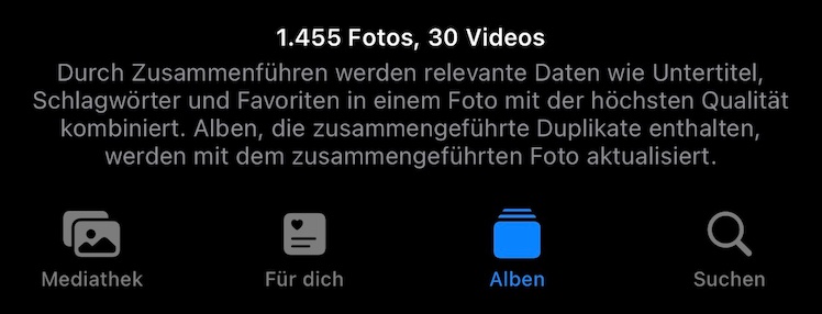 „Beim Zusammenführen werden relevante Daten wie Bildunterschriften, Schlüsselwörter und Favoriten zu einem Foto mit der höchsten Qualität kombiniert. Alben, die zusammengeführte Duplikate enthalten, werden mit dem zusammengeführten Foto aktualisiert.“