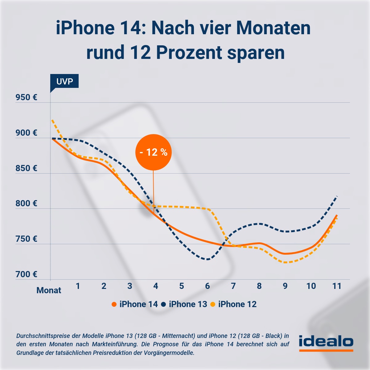 iPhone 14: 12 Prozent Ersparnis nach vier Monaten! Das wären dann 100 Euro weniger. Wer fünf Monate oder länger wartet, kann laut der Studie dann 15 Prozent und mehr.