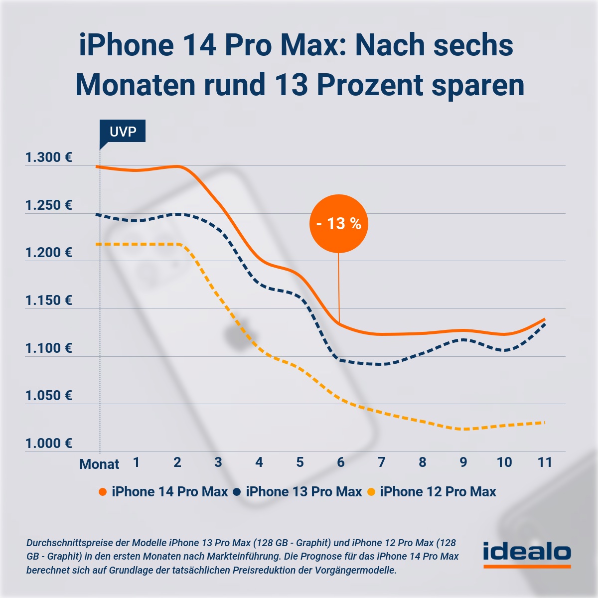 iPhone 14 Pro Max: Nach 6 Monaten etwa 13 Prozent günstiger!Beim Max sieht die Studie nach sechs Monaten 166 Euro Erspranis (minus 13 Prozent) und um 176 Euro (minus 14 Prozent) nach sieben Monaten.