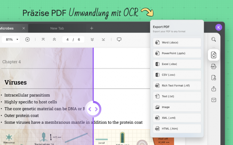 PDF-Dateien lassen sich auch konvertieren oder scannen.UPDF unterstützt auch die optische Zeichenerkennung (OCR), um gescannte oder bildbasierte PDFs in durchsuchbare oder bearbeitbare Dateien zu konvertieren.