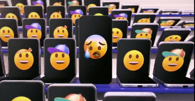 Zu sehen ist eine Art La Ola-Welle, die von sich zusammenklappenden Samsung-Smartphones erzeugt wird. Die iPhones, die nicht falt- und klappbar sind, stehen traurig dazwischen und weinen.
