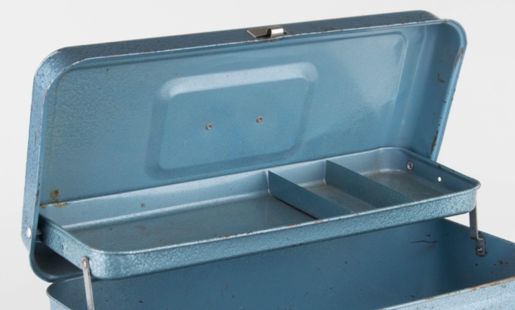 DER WERKZEUGKASTEN, MIT DEM APPLE COMPUTER GEBAUT WURDEN! Ein außergewöhnliches Relikt aus der Gründungszeit des größten und einflussreichsten Computerentwicklungs- und -herstellungsunternehmens in der Geschichte ist dieser blaue Stahlwerkzeugkasten, den der Apple Computer-Gründer Steve Wozniak in den prägenden Jahren vor 1978 besaß und offensichtlich intensiv nutzte. Der aqua-blau emaillierte Werkzeugkasten misst 13 Zoll in der Breite x 5 Zoll in der Höhe x 7 Zoll in der Tiefe und hat im geöffneten Zustand eine dreiteilige Ablage, die am Deckel befestigt ist. Auf der Oberseite des Werkzeugkastens befindet sich ein 4 Zoll langes, gelbes, selbstklebendes Dymo-Etikett mit dem Namen des Besitzers: „STEVE WOZNIAK“.