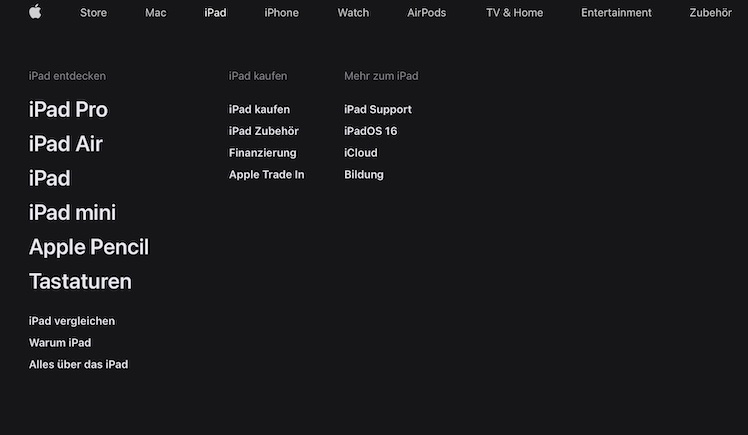Am Rechner gibt es neue Dropdown-Menüs, die erscheinen, wenn Ihr mit dem Mauszeiger über die Kategorien in der oberen Menüleiste fart. Dazu gehören: Store, Mac, iPad, iPhone, Watch, AirPods, TV & Home, Entertainment, Zubehör, Support, Suche und Einkaufstasche.