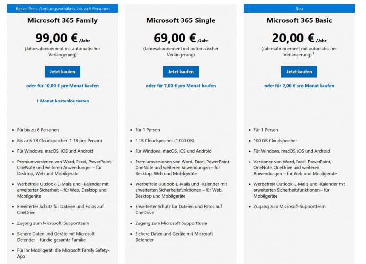Basic-Kunden erhalten 100 GB Cloud-Speicher und Zugang zu Basis-Funktionen Word, Excel und weiteren Office-Apps. Außerdem ist werbefreies Outlook inkludiert. Der Preis beträgt 2 Euro pro Monat oder 20 Euro pro Jahr.