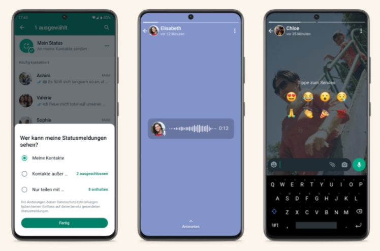 Wie bei Instagram-Stories läuft das über acht Emojis, die beim Hochwischen ausgewählt werden können. Status-Einträge können jetzt außerdem Sprachaufnahmen enthalten.