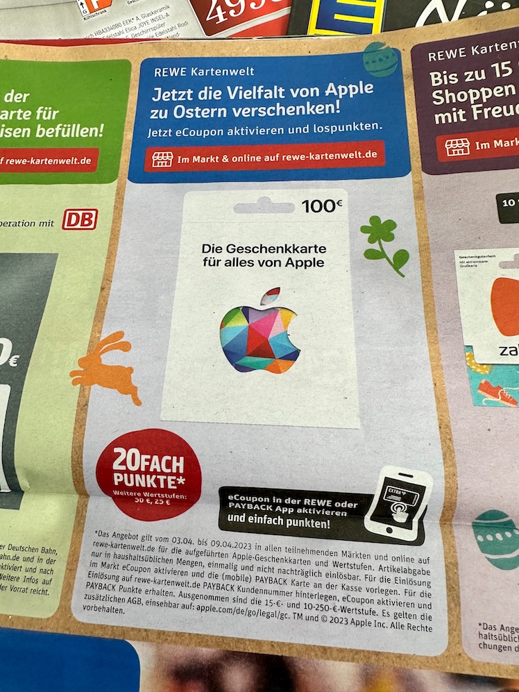 iTopnews-Leser Tennis Louis hat uns nach seinem frühen Einkauf bereits informiert: Ihr bekommt 20-fache Payback-Punkte beim Kauf einer Apple-Geschenkkarte im Wert von 25, 50 oder 100 Euro.