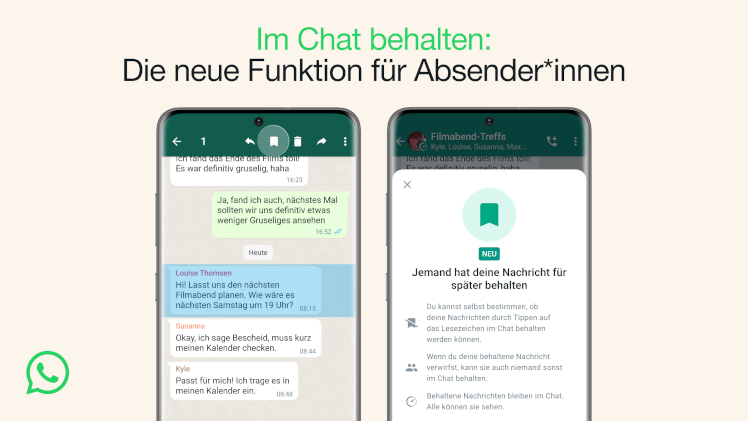 Aus diesem Anlass möchten wir heute die Funktion „Im Chat behalten“ vorstellen: Nun kannst du Nachrichten speichern und zu einem späteren Zeitpunkt auf sie zugreifen. Außerdem kannst du als Absender*in entscheiden, ob diese Funktion für andere aktiviert sein soll. Wir glauben nämlich, dass du als Absender*in darüber bestimmen können solltest, wer Nachrichten im Chat für später behalten kann oder nicht.
