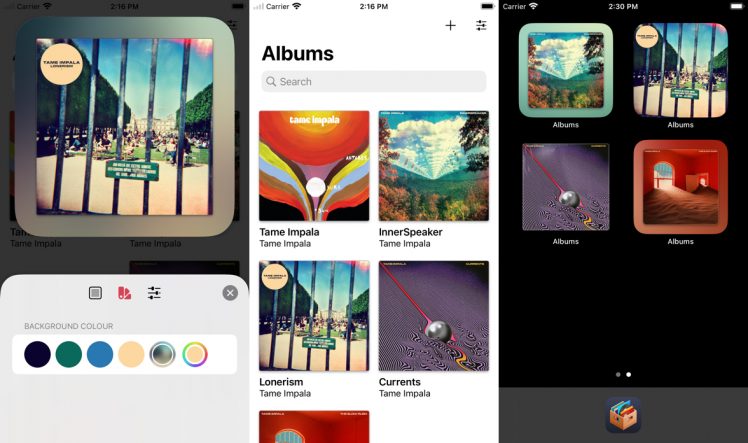 Das Tool erlaubt es Euch, Alben aus Eurer Musik-Sammlung auszuwählen. Dabei wird das Cover-Bild geladen und ihr könnt noch den Rahmen anpassen, bevor Ihr es auf den Homescreen legt.