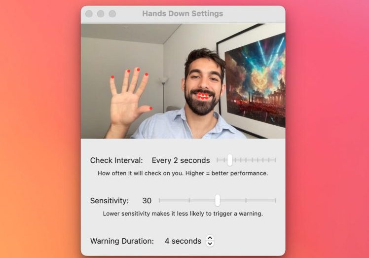 Die Anwendung nutzt die Kamera Eures Macs. In einem von Euch eingestellten Intervall wird das Bild analysiert und überprüft, ob sich Eure Finger Eurem Mund nähern. So soll Nägelkauen verhindert werden!