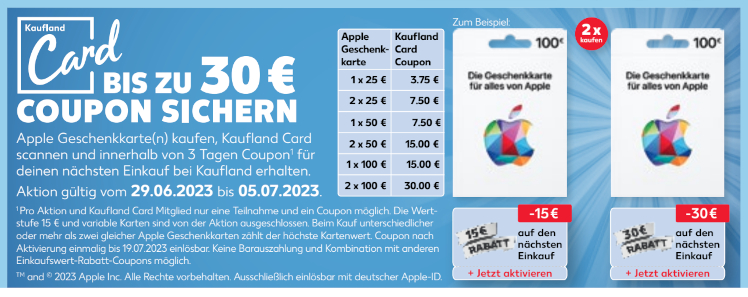 Dann bekommt Ihr derzeit bei Kaufland eine perfekte Gelegenheit. Dort gibt es für die sogenannte Apple Gift Card bis zum 5. Juli einen Coupon in Höhe von bis zu 30 Euro (15 Prozent).