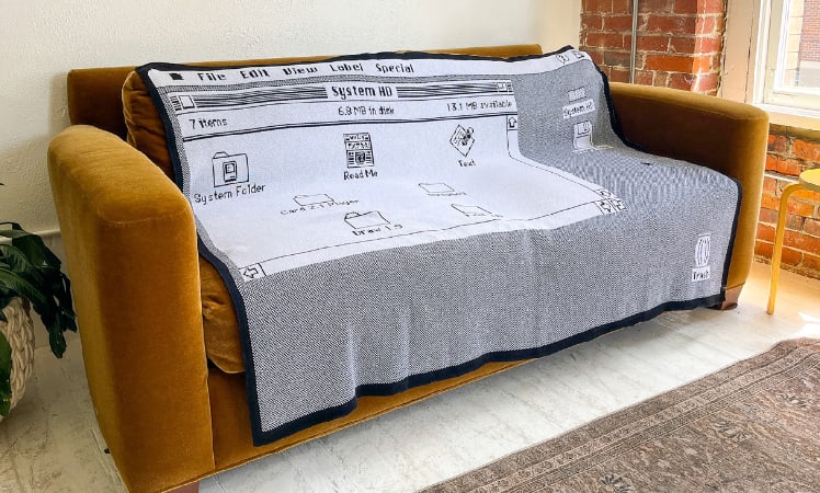 Im Angebot des Herstellers von Kissen, Decken und Kleidung ist auch etwas für Mac-User dabei. Es handelt sich um eine schicke Baumwolldecke mit dem Desktop des ersten Macintosh-Rechners aus den 80ern.