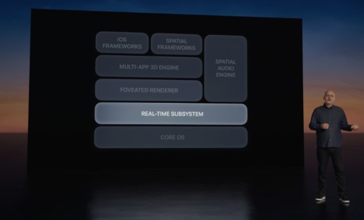Für die Rechenleistung sind zwei Apple Silicon Chips im Einsatz. Für die Sensorik ist der neue R1 Chip zuständig, der die Daten unter anderem von 12 Kameras und sechs Mikrofonen live analysiert und Daten in 12 Millisekunden an das Display streamt. Mit ihm fühlt sich alles erst so richtig echt an. Die darunter liegende Software nennt Apple visionOS. Dessen Struktur seht Ihr unten auf dem Diagramm aus der Keynote. Das System ist das erste, das rein auf räumliches Computing ausgerichtet ist.