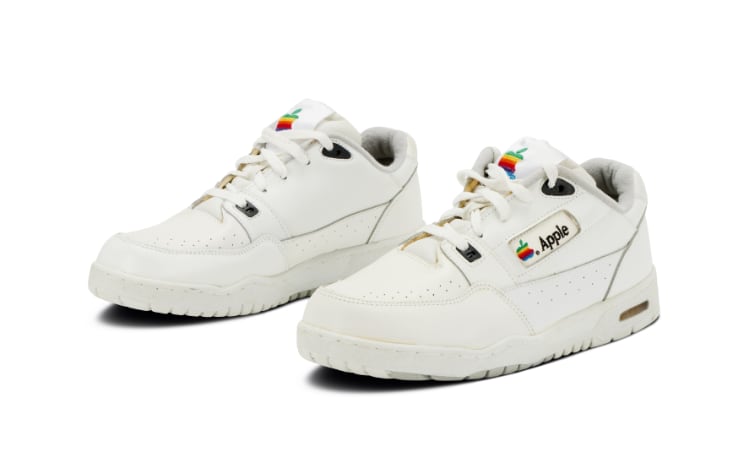 Dazu gehören weiße Sneaker, die der Konzern Mitte der 90er zusammen mit Omega rausgebracht hat. Ein neuwertiges Paar steht jetzt beim Auktionshaus Sotheby’s zum Verkauf.