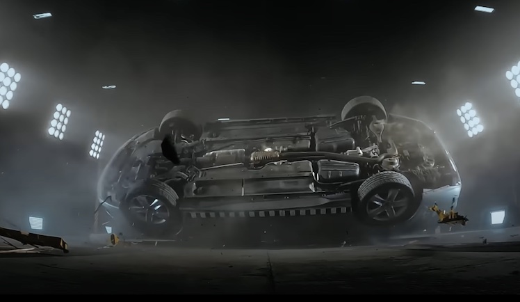 Denn er wird in dem Clip länger in einem rotierenden Auto durch die Luft geschleudert und landet mehr als unsanft. Daraufhin erscheint auf dem Bildschirm der Slogan „Relax, it’s an iPhone“.