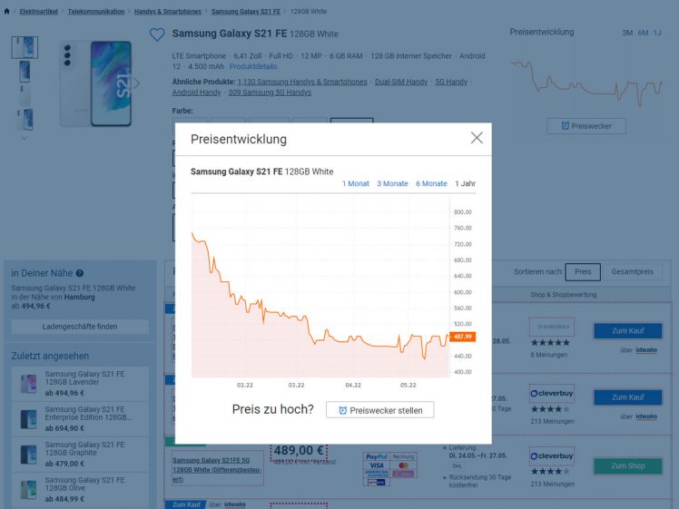 Erst legt Ihr eine Liste der Wunschprodukte an. Idealo hat auch einen Merkzettel integriert. Der Preisverlauf wird dort visualisiert, bis zu 12 Monaten zurück.