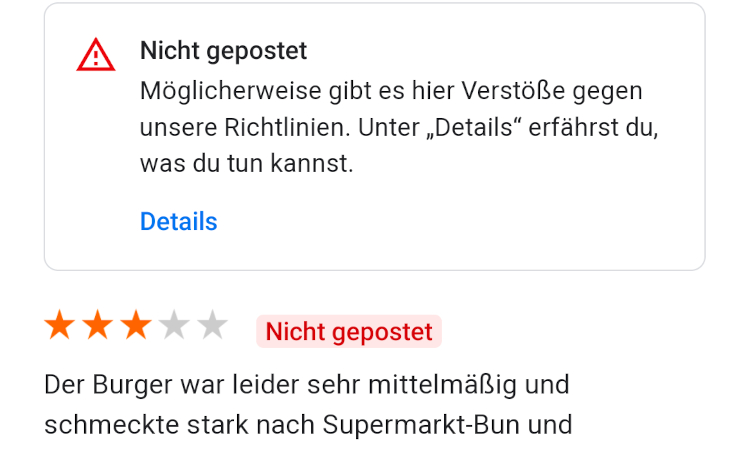 Sie erhalten eine Nachricht, dass ihre Rezension möglicherweise nicht den Richtlinien entspricht. Es ist jedoch möglich, Einspruch dagegen einzulegen.
