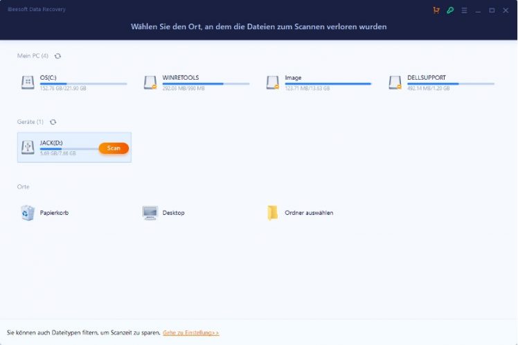 iBeesoft Data Recovery unterstützt die Wiederherstellung verlorener Daten von Festplatten, SSDs, SD-Karten, Flash-Laufwerken, USB-Laufwerken, Kameras und anderen. Es umfasst Speicher-Dateisysteme in FAT (FAT12, FAT16, FAT32), ExFA, NTFS, NTFS5, EXT2/EXT3, HFS+ und ReFS.