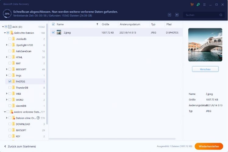 In der Regel scannt diese Art von Software Ihre Festplatte, sucht nach wiederherstellbaren Dateien und zeigt sie an, damit man die gefundenen Dateien in der Vorschau ansehen und wiederherstellen kann. Es gibt einige Datenrettungsprogramme im Internet. Wir haben iBeesoft Datenwiederherstellung kürzlich getestet. Hier sind unsere Erfahrungen.