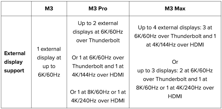 Der M3 erlaubt auch nur bis zu 6K/60 Hz. Immerhin: Beim M3 Pro und Max sind bis zu 8K/60 Hz möglich.