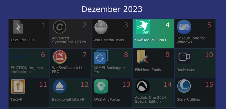 31 handverlesene Softwareprogramme werden dabei kostenlos angeboten. Dazu gehört unter anderem Multimedia-Software, ein System-Toolkit und Backup-Software , ein PDF-Tool, ein Bildeditor und weitere nützliche Tools. Der Gesamtwert liegt bei knapp 1500 Euro.