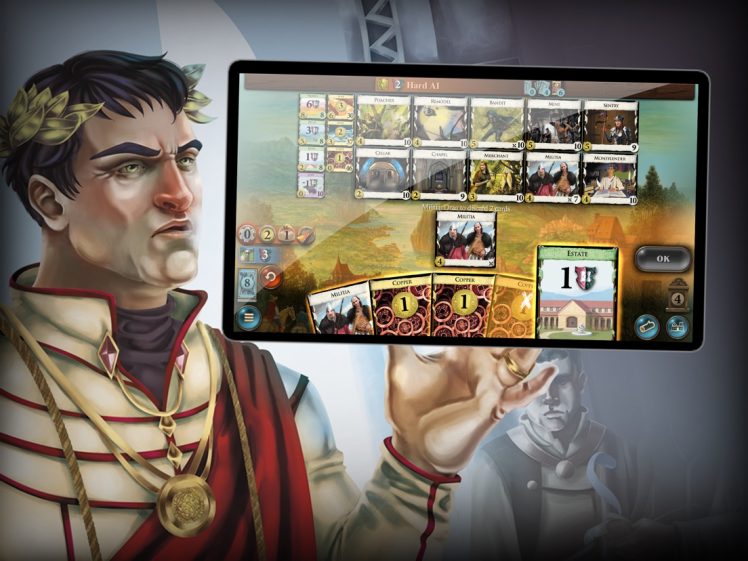 Wählt ihr die KI als Gegner aus, gibt es vier Schwierigkeitsgrade. Die KI lernt mit jedem Spiel dazu, die Gegner werden immer anspruchsvoller, je länger Ihr Dominion spielt.