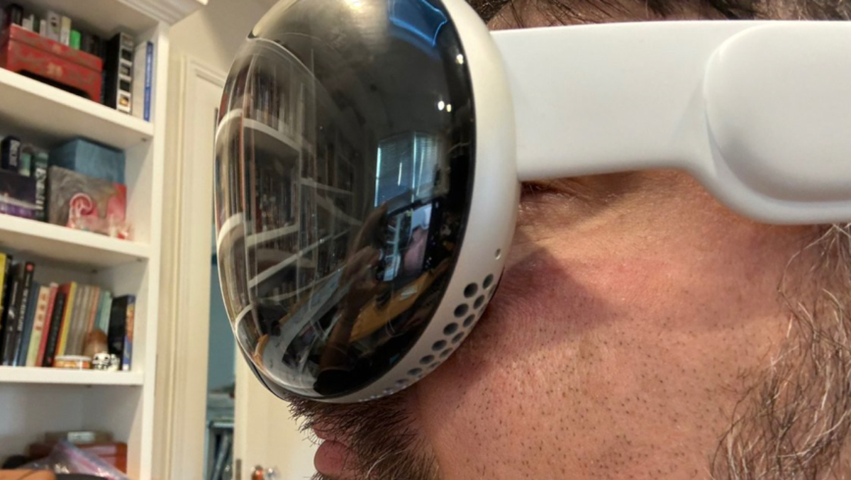Die Nutzung des Vision Pro im Passthrough-Modus ohne die Dichtung und nah am Gesicht lässt das Gerät mehr wie eine Brille mit breitem Rahmen wirken.