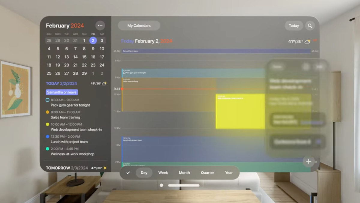 Was bereits verfügbar ist, das ist eine Vision-Version von Fantastical. Die Macher der Kalender-App haben sie ja bereits auf vielen Plattformen im Angebot – nun auch auf der Brille.