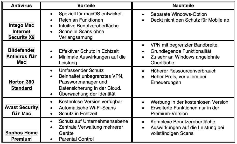 - Antivirus und Anti-Spyware : Schützt vor Viren, Malware und Spyware, die speziell auf macOS abzielen.