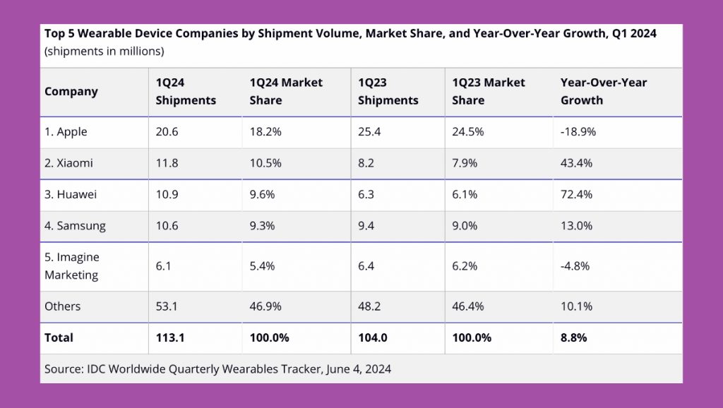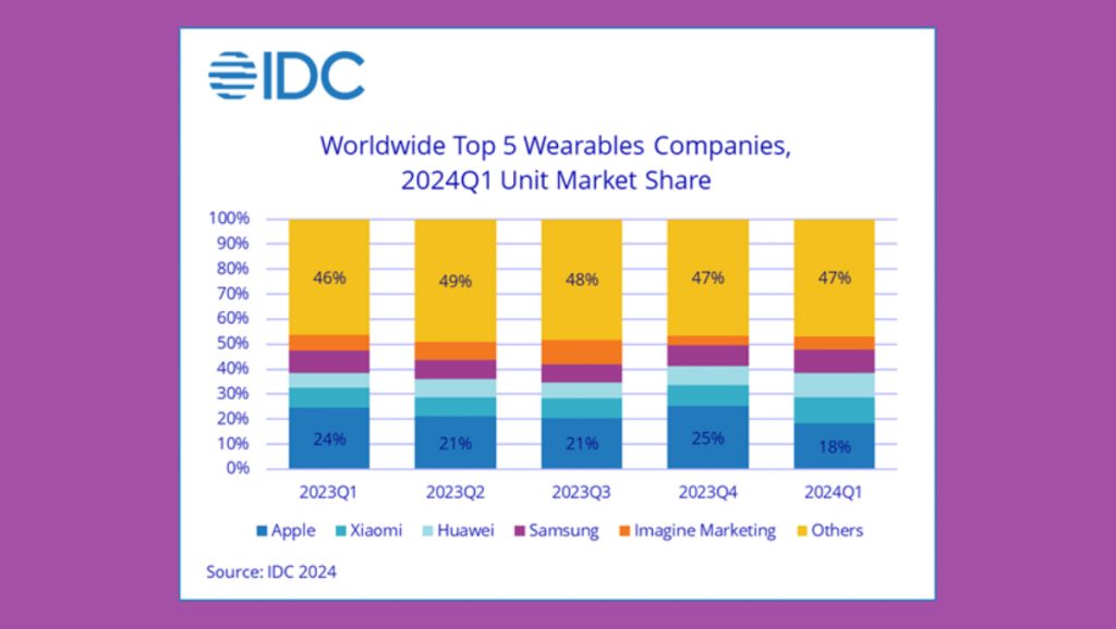 Apple verkauft derzeit mit Apple Watch und AirPods noch die meisten Wearable-Produkte. Deren Verkäufe sind aber stark eingebrochen – minus 18,9 Prozent im Vergleich zum ersten Quartal 2023.