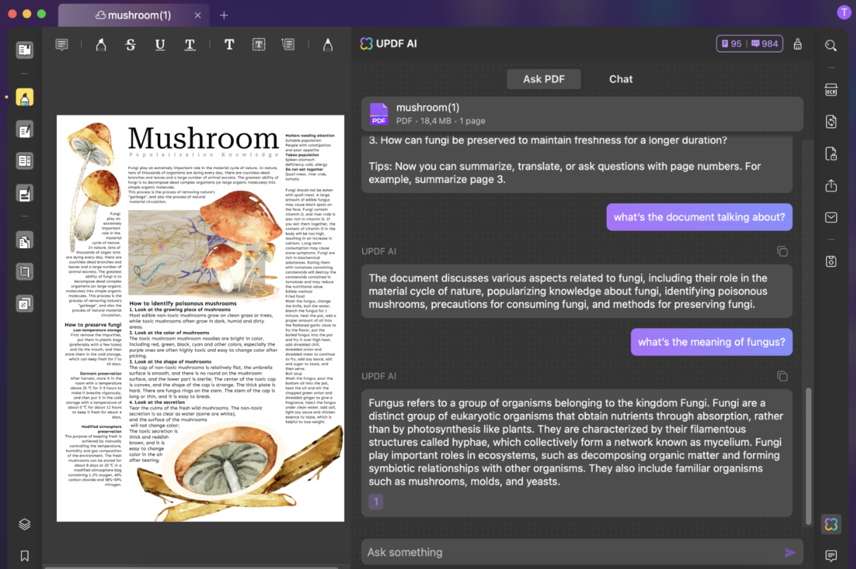 UPDF ist mit seiner zuverlässigen KI-Unterstützung seinen Mitbewerbern einen Schritt voraus. Sie können lange PDFs zusammenfassen, komplexe Diagramme und Wörter erklären und aus allen Sprachen übersetzen. Sie können auch mit Ihren PDFs interagieren, indem Sie den UPDF AI Fragemodus verwenden. Darüber hinaus können Sie im Chatmodus Themen erkunden, die über das PDF hinausgehen.