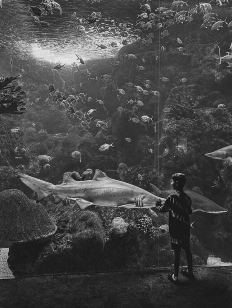 Der Gewinner des „Grand Prize“ ist Erin Brooks aus den USA. Das zugehörige Foto wurde auf einem iPhone 15 Pro Max aufgenommen. Es zeigt ein Kind in Schwarz-Weiß vor einem großen Aquarium in Tampa (Florida).
