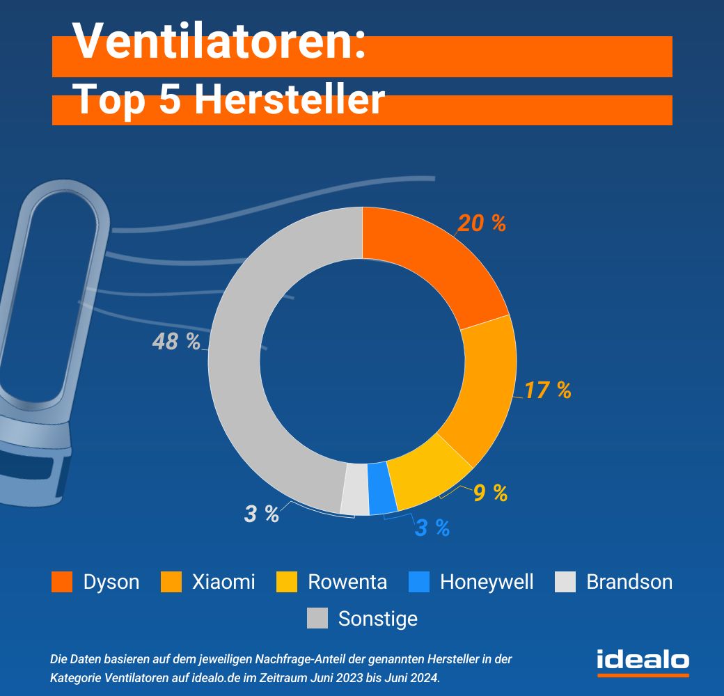 Dyson dominiert laut der Idealo-Studie den Markt für rotorlose Ventilatoren, gefolgt von Xiaomi und Rowenta. Rund 1 Prozent der bei idealo angebotenen Ventilatoren sind rotorlos, dennoch machen diese 20 Prozent des Kaufinteresses aus. Neben Dyson, Xiaomi und Rowenta zählen Honeywell und Brandson zu den Top 5 Herstellern, die über die Hälfte der Nachfrage decken.
