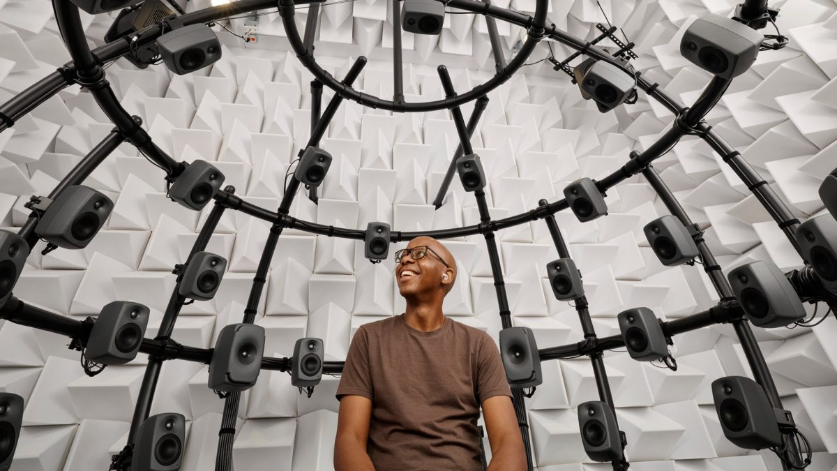 Auf der anderen Seite des Audio Lab wird dafür gesorgt, dass jedes von Apple entwickelte Gerät die höchste Soundqualität hat. Dafür verwendet Fantasia Lab eine kugelförmige Anordnung aus 50 Lautsprechern, um in einem genau abgestimmten, gleichmäßig verteilten Klangfeld Hunderte von Geräuschkulissen aus der realen Welt zu simulieren – etwa ein Einkaufszentrum, eine belebte Straße oder eine Flugreise.