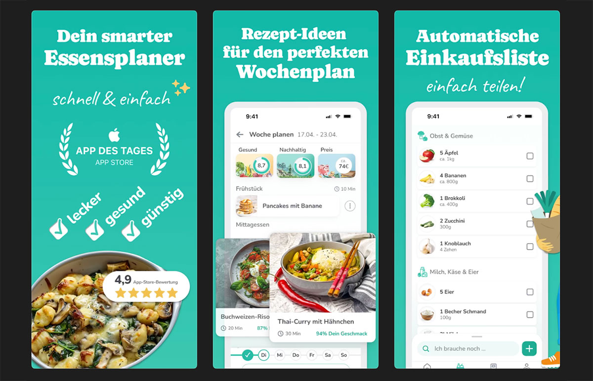 Besonders praktisch ist die automatische Einkaufsliste, die aus dem wöchentlichen Essensplan generiert wird. Diese könnt ihr nicht nur in den Supermarkt mitnehmen, sondern auch direkt an Partner wie Rewe übertragen, um euch den Einkauf nach Hause liefern zu lassen. Wenn ihr möchtet, könnt ihr alternativ die Liste auch mit eurer Familie teilen und so die Planung und den Einkauf gemeinsam erledigen bzw. aufteilen.