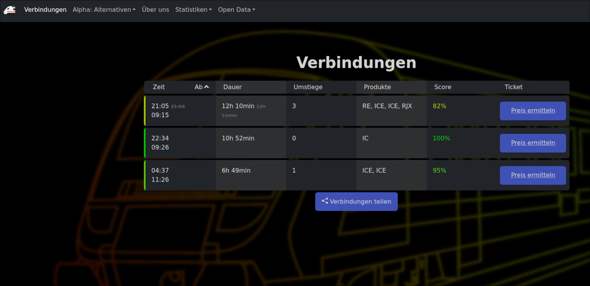 Auf der Website könnt ihr eure Route eingeben und bekommt dann eine Auflistung, welche Züge mit welcher Wahrscheinlichkeit pünktlich sein werden und welche Anschlüsse erreichbar sind.