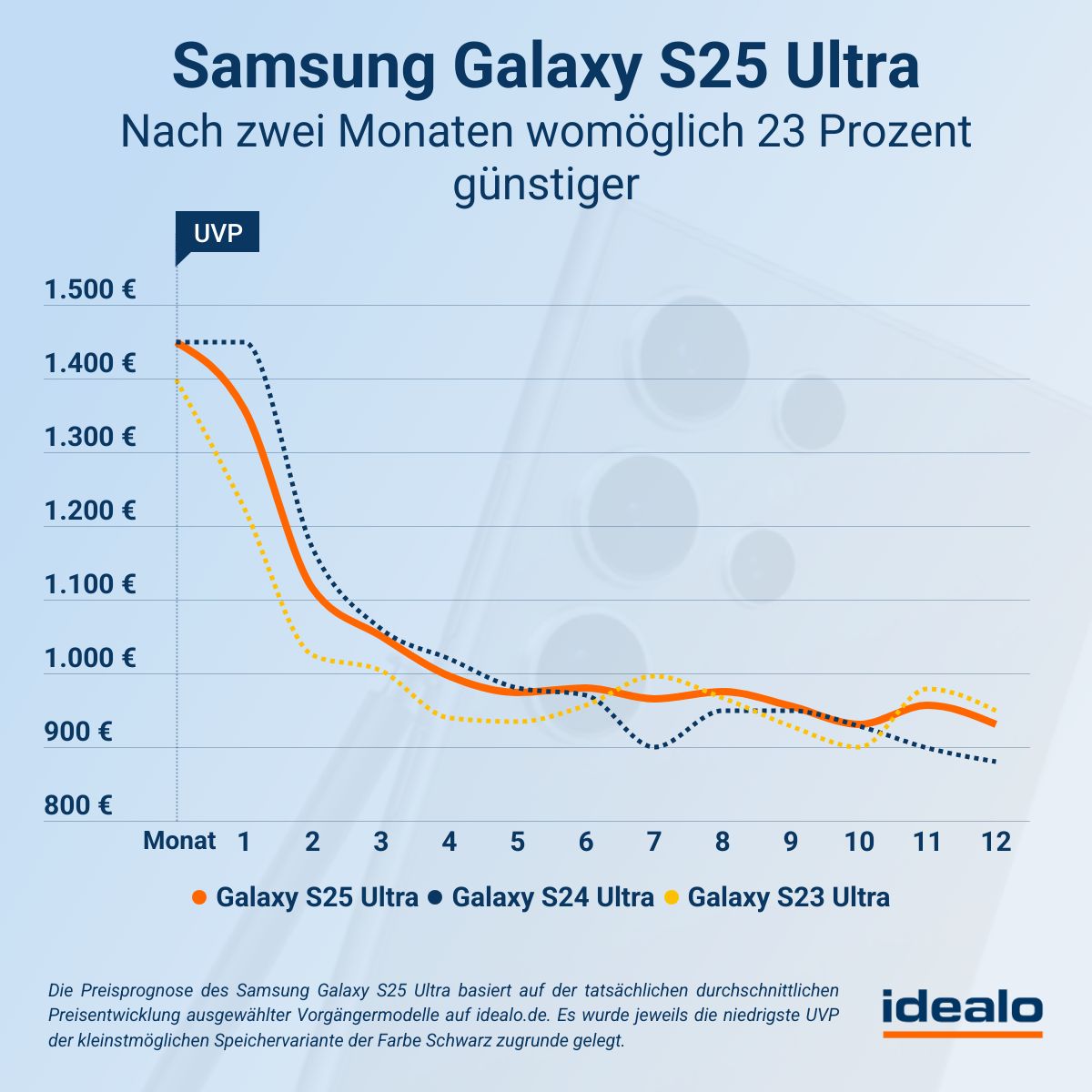Trotz des hohen Einstiegspreises könnte das Ultra-Modell nach zwei Monaten bereits 23 % günstiger sein, was den Preis auf etwa 1115 Euro senken würde. Nach vier Monaten wird es richtig interessant, wenn der Preis laut Idealo-Studie erstmals unter die 1000-Euro-Marke fallen könnte – eine Ersparnis von rund 31%.