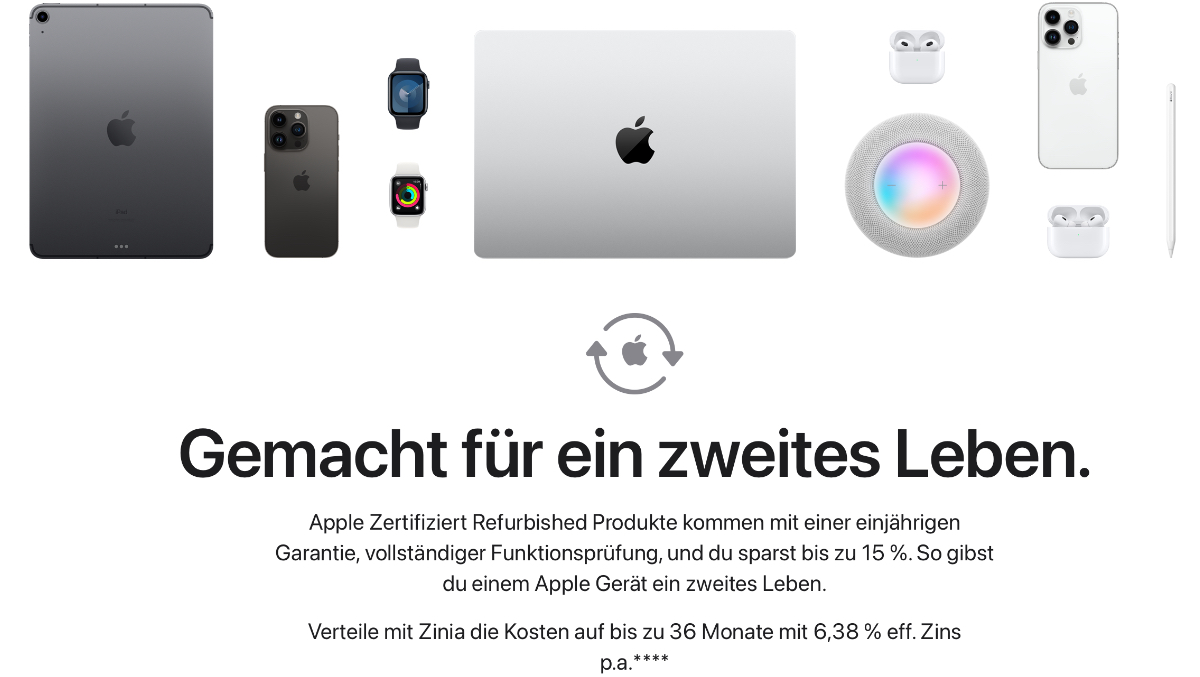 Der neue Claim „Gemacht für ein zweites Leben“ hebt die Vorzüge solcher Refurbished Produkte extra hervor. Zuvor schrieb Apple an dieser Stelle: „Garantierte Apple-Qualität“.